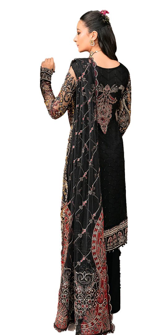 The Embroidered is handmade front with sequence (Net). Embroidered back with sequence (Net). Embroidered handmade sleeve with sequence (Net). Embroidered patch for daman (Organza). Embroidered dupatta with sequence (Net). Embroidered pallu for dupatta (Organza). Embroidered dupatta patti (Organza). Raw silk for lining 2.5 yard. Raw silk trouser 2.5 yard