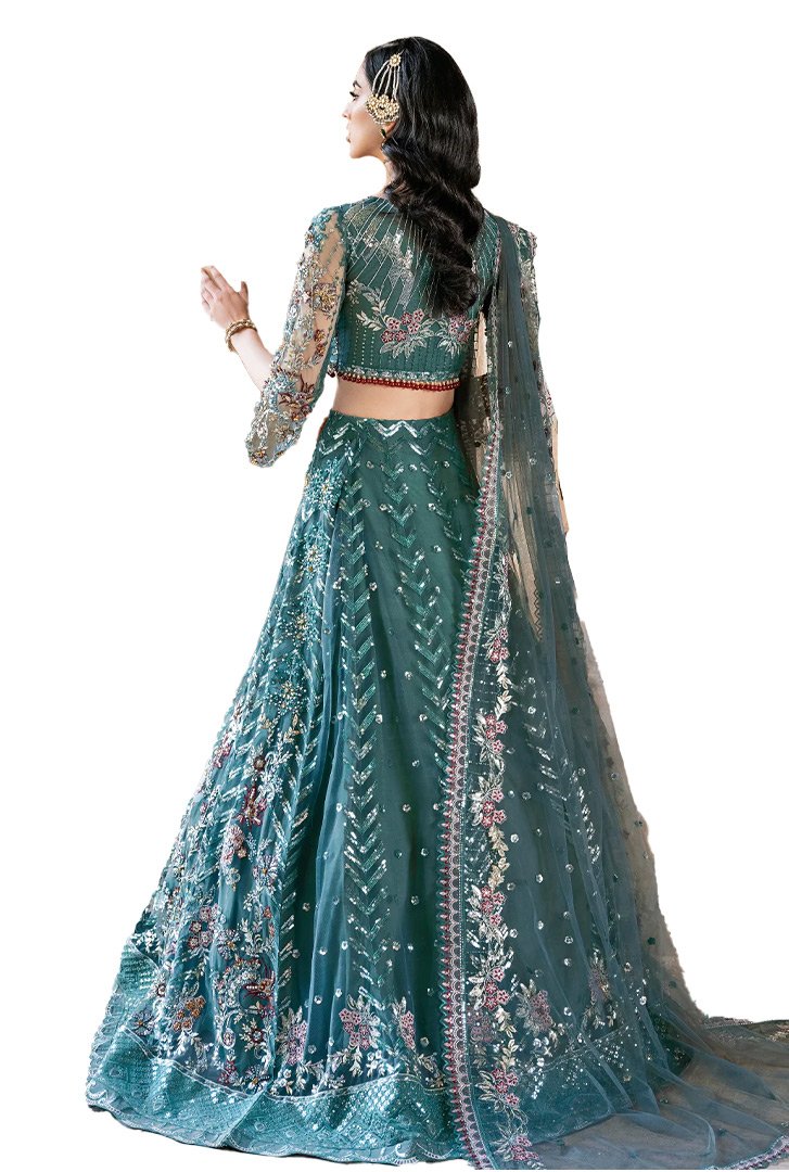 The Embroidered is handmade front with sequence (Net). Embroidered back with sequence (Net). Embroidered handmade sleeve with sequence (Net). Embroidered patch for daman (Organza). Embroidered dupatta with sequence (Net). Embroidered pallu for dupatta (Organza). Embroidered dupatta patti (Organza). Raw silk for lining 2.5 yard. Raw silk trouser 2.5 yard