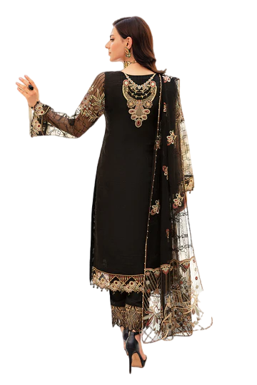 The Embroidered is handmade front with sequence (Net). Embroidered back with sequence (Net). Embroidered handmade sleeve with sequence (Net). Embroidered patch for daman (Organza). Embroidered dupatta with sequence (Net). Embroidered pallu for dupatta (Organza). Embroidered dupatta patti (Organza). Raw silk for lining 2.5 yard. Raw silk trouser 2.5 yard