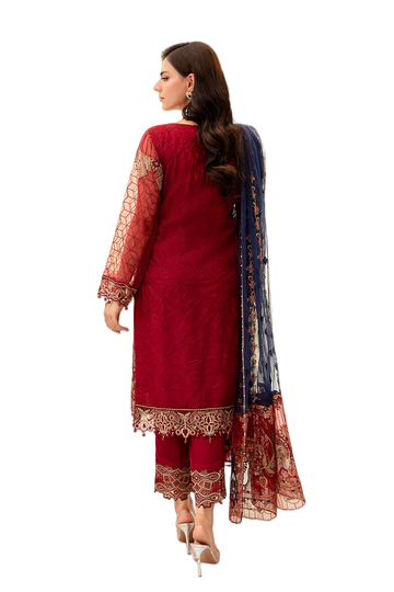 The Embroidered is handmade front with sequence (Net). Embroidered back with sequence (Net). Embroidered handmade sleeve with sequence (Net). Embroidered patch for daman (Organza). Embroidered dupatta with sequence (Net). Embroidered pallu for dupatta (Organza). Embroidered dupatta patti (Organza). Raw silk for lining 2.5 yard. Raw silk trouser 2.5 yard